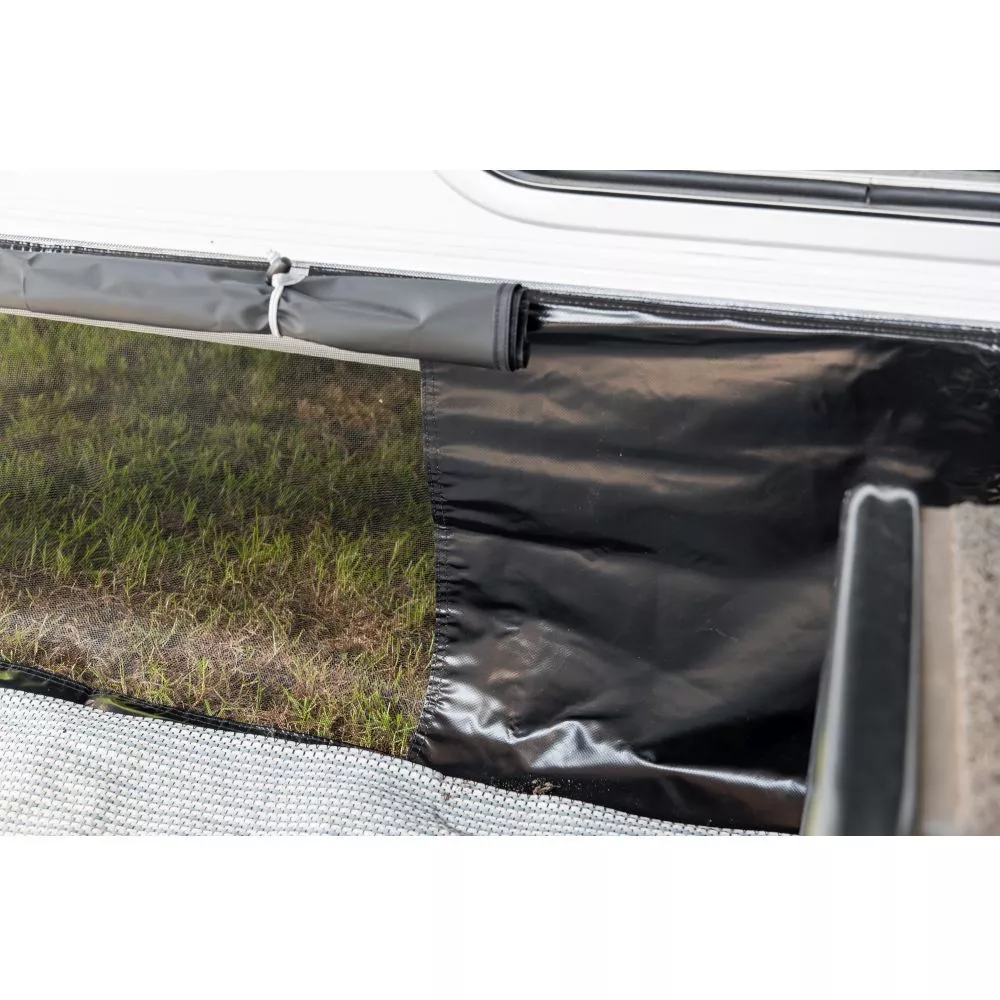 zwei abnehmbare Seitenwände mit getönter Fensterfolie, Türfunktion und Moskitonetzen mit Blickschutz