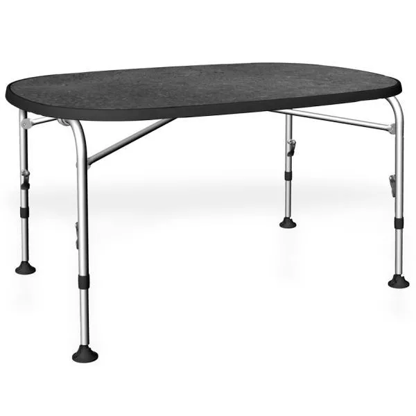 Der grosse Premium-Campingtisch Westfield Performance Superb 130 besticht mit beeindruckender Qualität. An der ovalen Tischplatte finden bis zu sechs Personen Platz. Die Severin-Tischplatte ist absolut kratz- und wasserfest, sowie bis 180° C hitzebeständig. Jedes der vier robusten Tischbeine ist mit einem einfach zu bedienendem Schnellverschluss in der Höhe verstellbar, was für sehr stabilen Stand sorgt. Die Tellerfüsse schonen den Zeltteppich. Wird der Tisch nicht benötigt, lässt sich das Tischbein-Gestell kompakt unter der Tischplatte verstauen.