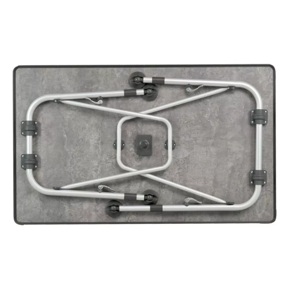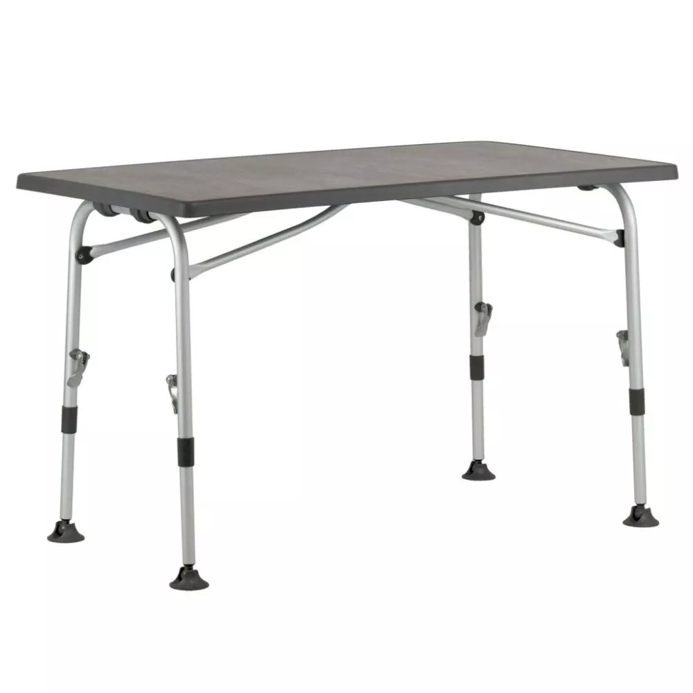 Der Camping-Klapptisch Westfield Superb 80 mit einem stabilen Gestell aus Aluminium-Rundrohr und einer wetterfesten Tischplatte erscheint in elegantem Design. Alle 4 Tischbeine sind einzeln und stufenlos höhenverstellbar. Mit einer einfach zu bedienenden Exzenterverriegelung mit Schnellverschluss gelingt die Höhenverstellung leicht und einfach. Die Tellerfüsse mit Kugelgelenk ermöglichen einen festen Stand, schonen den Vorzeltteppich und verhindern das Einsinken auf weichem Boden.Â