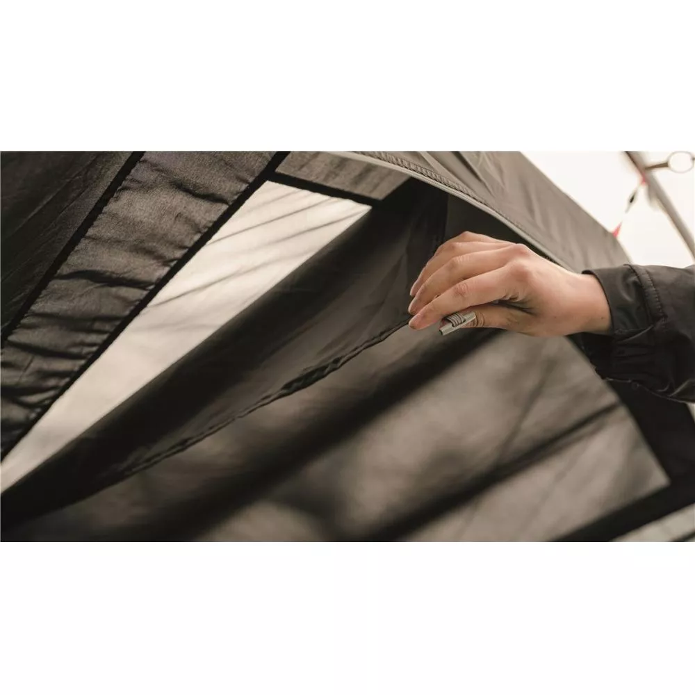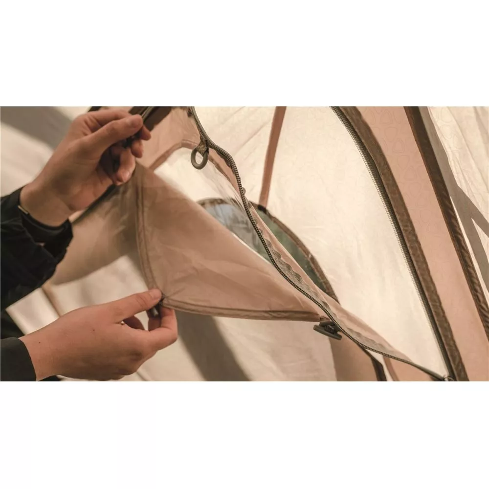 Im hinteren Bereich regulieren niedrig angeordnete Lüftungsöffnungen die Luftzufuhr. Durch Netzeinsätze hinter den Aussentüren wird die Belüftung zusätzlich unterstützt und dabei lästige Insekten aus deinem Campingzelt ferngehalten. Das Fenster des vier Personen Zelts ist ebenfalls mit einem Netzeinsatz versehen und zudem mit einem wasserdichten Vorhang ausgestattet.