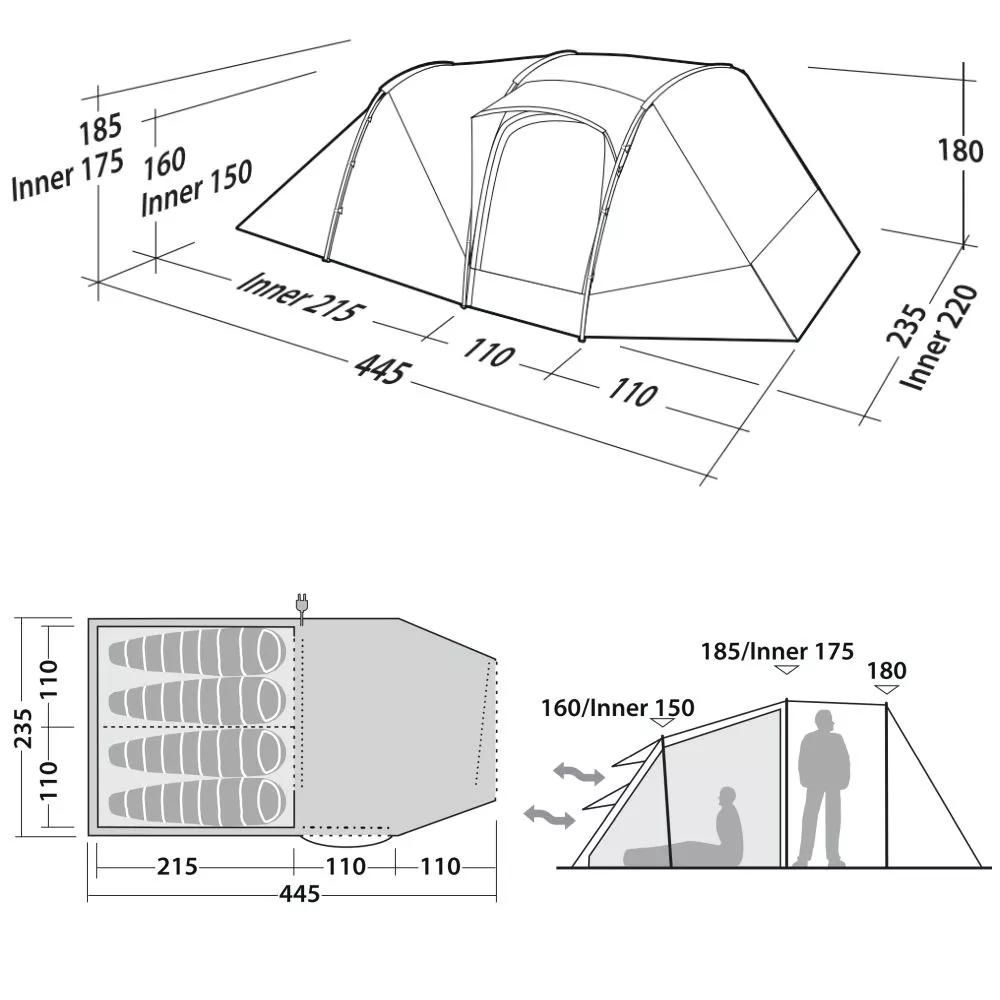 1 Schlafraum für 4 Personen: 220 x 215 x 150/175 cm (BxTxH)