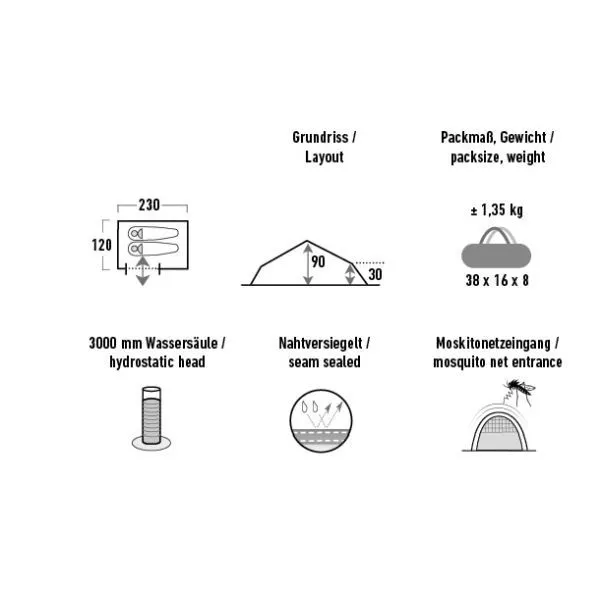 Überzelt: 190T Polyester PU, Wassersäule: 3.000 mm